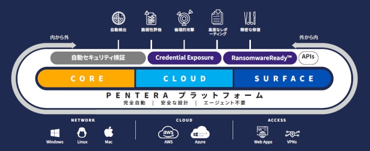 CTEMの概念に即したセキュリティ製品として注目されているのが、Penteraという自動ペネトレーションテストツールです。Penteraは実際の攻撃手法を模倣したシナリオを自動で実行し、攻撃成立の可視化を提供します。