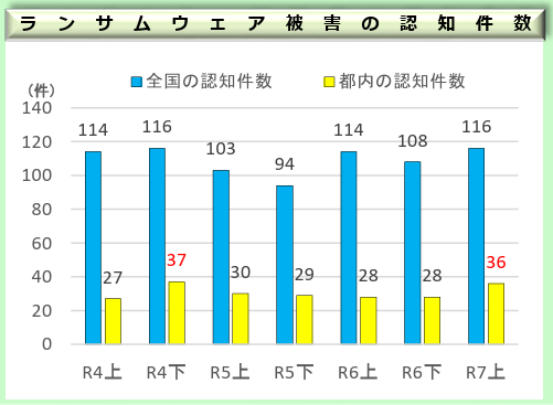 例えばランサムウェア被害の認知件数の場合、2025年上半期に東京都内で報告された認知件数は36件に達し、これは2022年下半期に迫る水準です。半期ベースで見ると、過去2番目に多い件数となり、依然として高い発生頻度が続いていることがわかります。