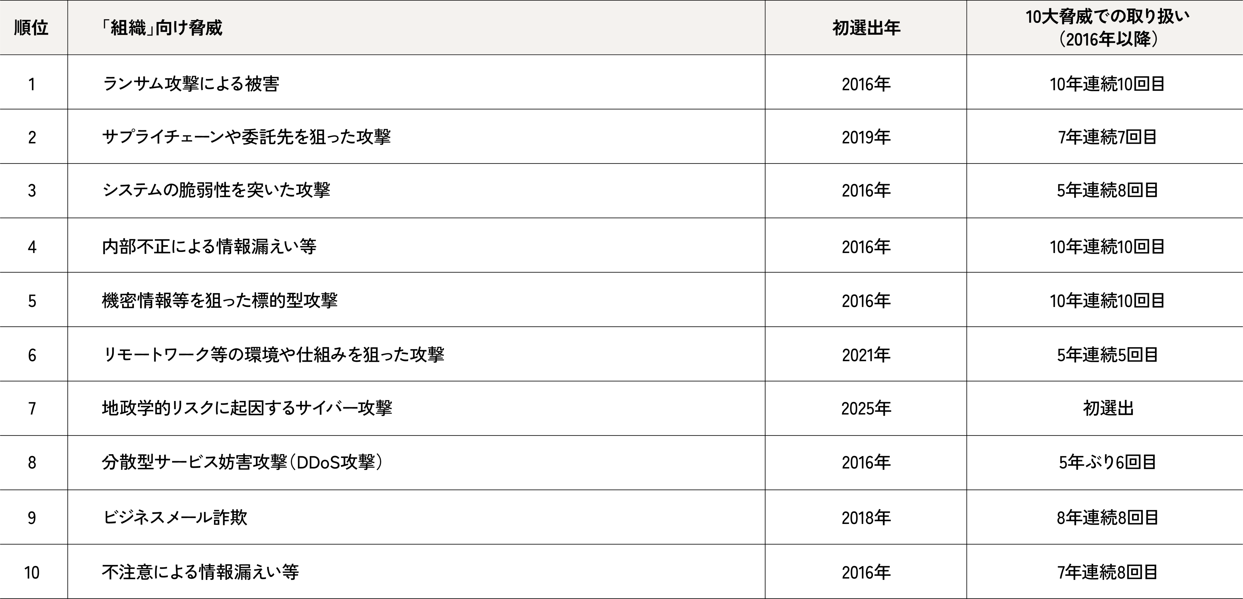 出典:独立行政法人 情報処理推進機構(IPA)「情報セキュリティ10大脅威 2025 [組織]」をもとに作成