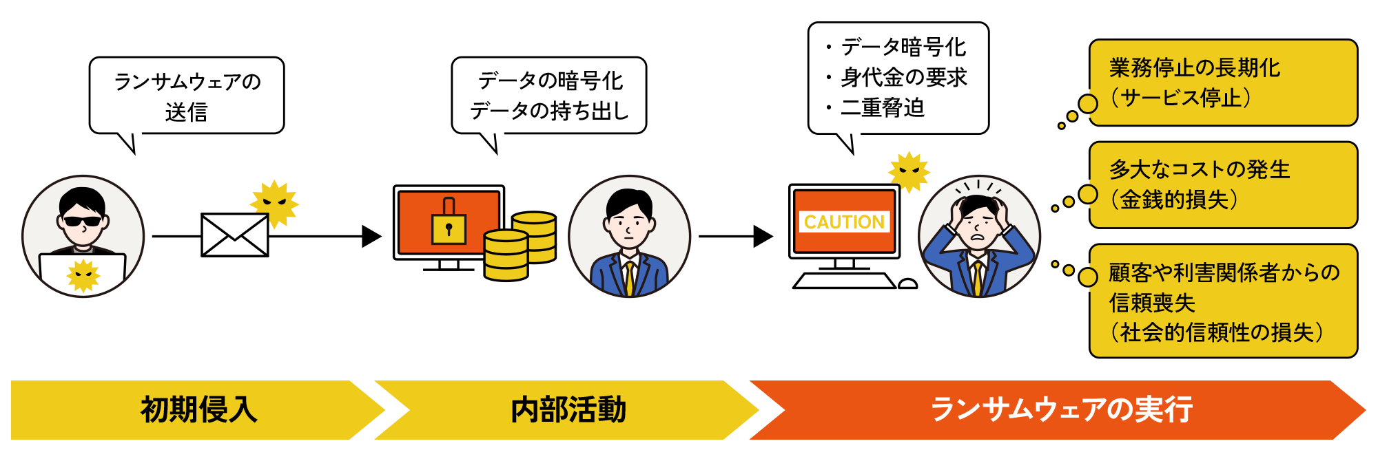 ほかにも、企業が業務停止中に競合他社からシェアを奪われるなど、ランサムウェア感染の影響範囲は多岐にわたります。