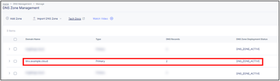 DNS Zone Management画面で設定が行えていること、DNS_ZONE_ACTIVEを確認します。