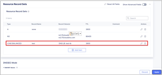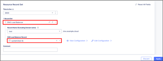 5. Record SetでDNS Load Balancerを選択、DNS Load Balancer Recordに作成したDNS LBを選択し、Applyをクリック