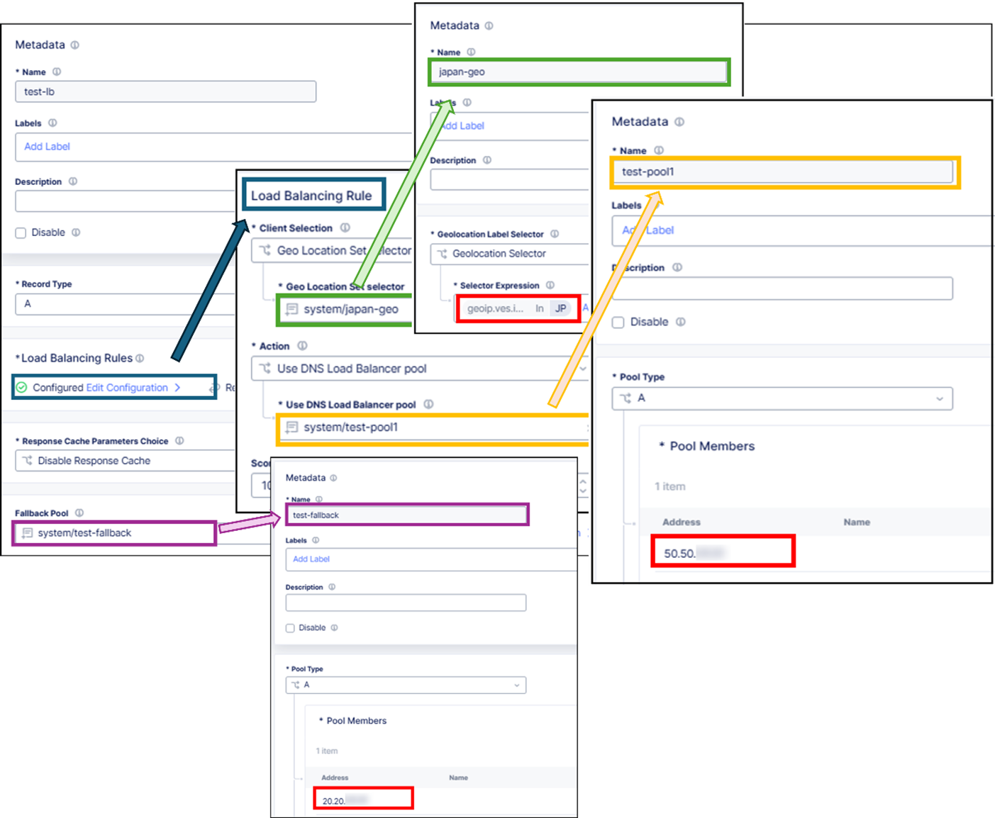 XC DNS LBは、DNSクエリ送信元に対して応答を指定するロードバランシングルールで構成されます。これらのルールを設定することで、クライアント(送信元IPアドレス)の地理情報を条件にDNSレスポンスを送信できます。つまり、日本からのDNSクエリに対してはIPアドレスA、アメリカからのDNSクエリに対してはIPアドレスB、といったように国ごとに応答するIPアドレスを変えるような制御が可能です。